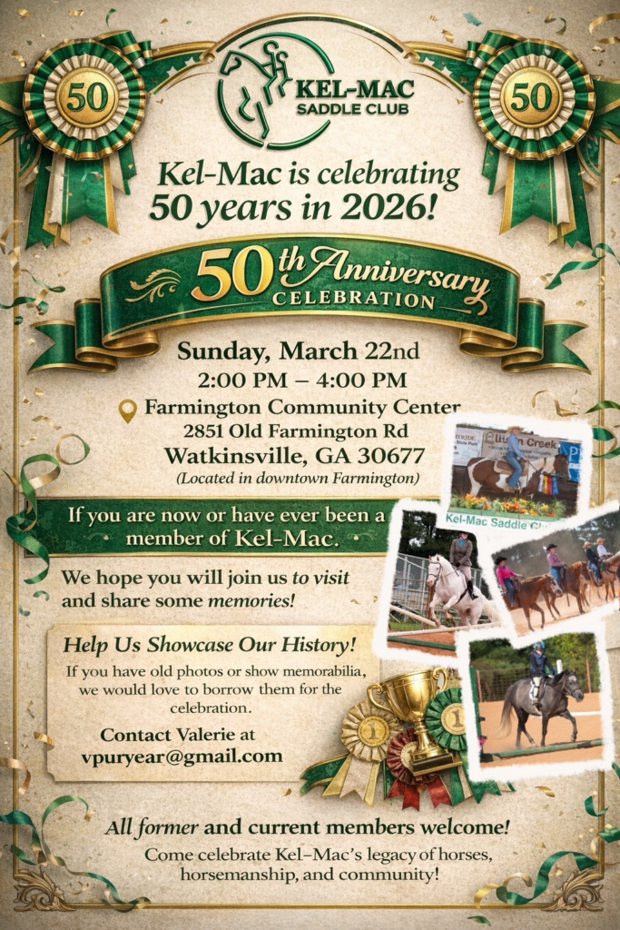 Join us in honoring Georgia’s longest-running saddle club! Since its start in 1976, Kel-Mac Saddle Club has become a cornerstone of our community, blending horsemanship with an incredible legacy of philanthropy—raising over $170,000 for local charities and scholarships.